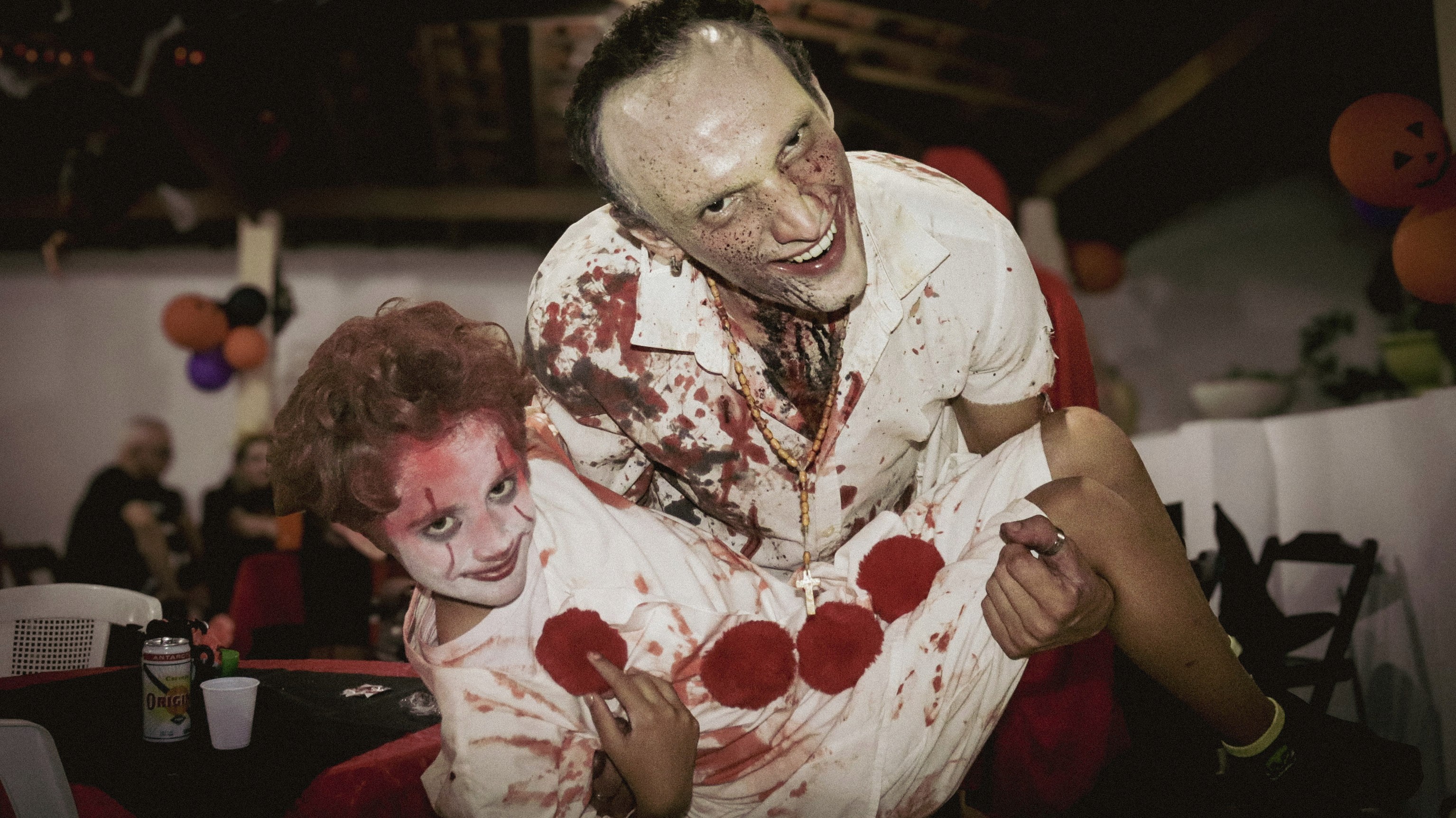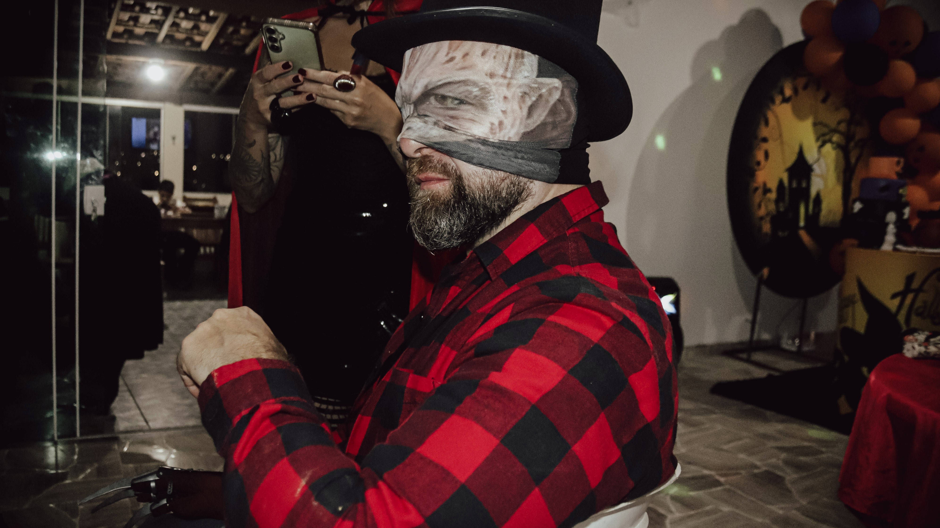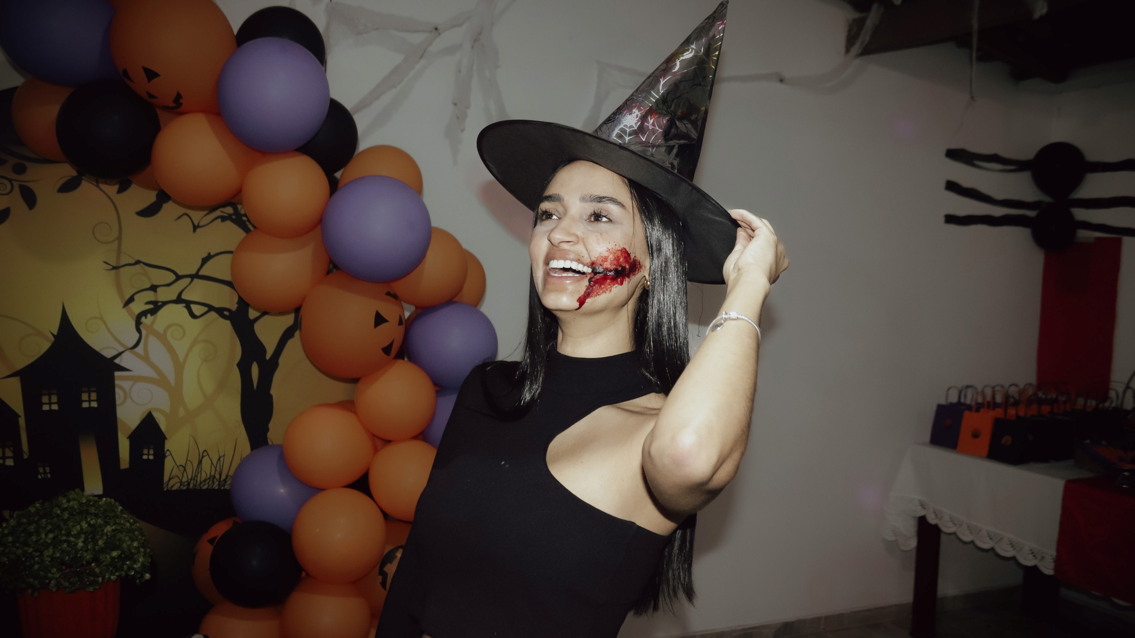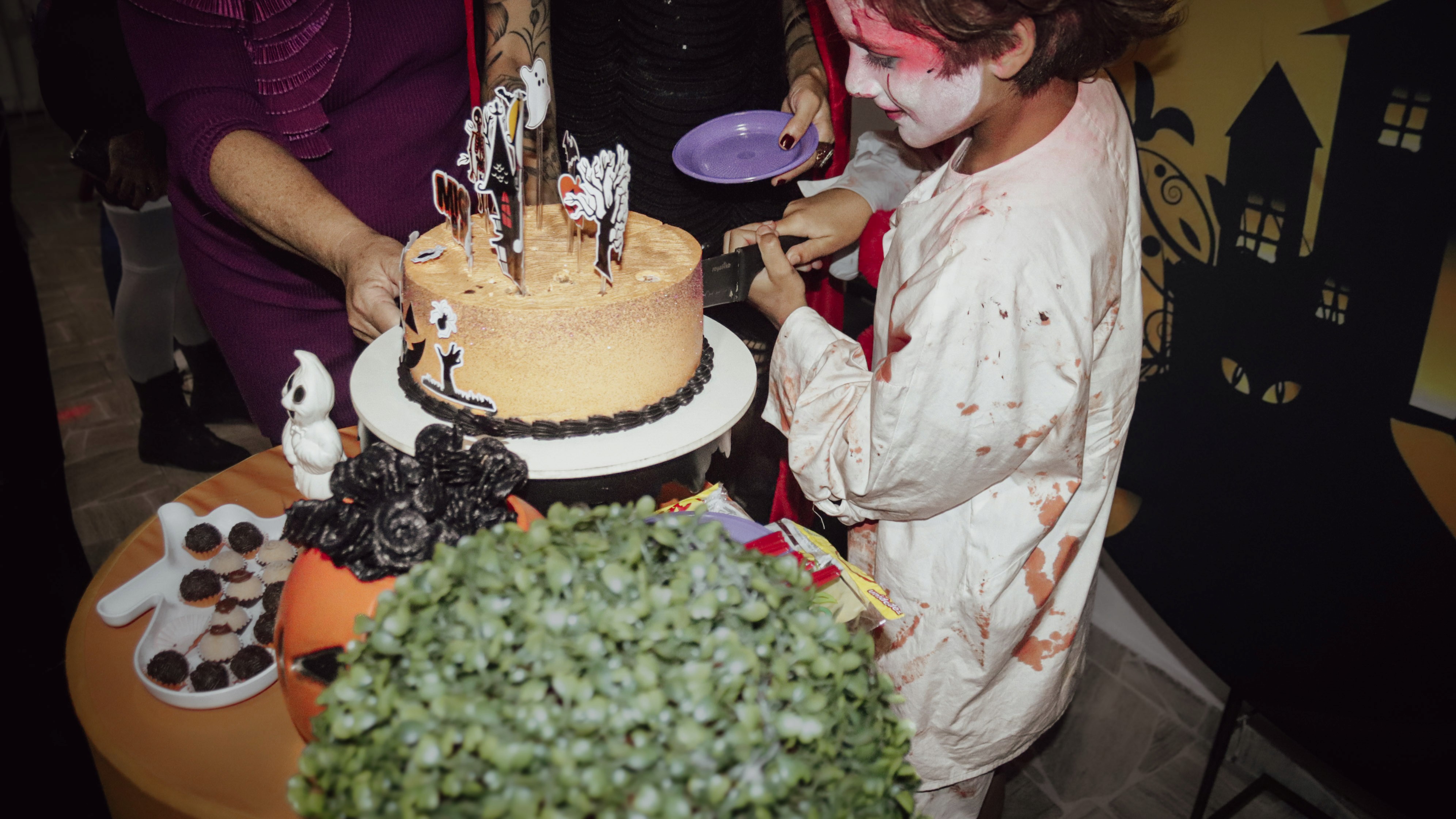 A decoração foi o grande destaque, transportando os convidados para um casarão mal-assombrado repleto de detalhes. De morcegos pendentes a abóboras iluminadas, cada canto da festa foi pensado para criar uma atmosfera de mistério. Para um fotógrafo, um evento com essa riqueza visual é um prato cheio: as cores vibrantes do laranja e roxo contrastando com o preto criaram composições dinâmicas e cheias de contraste.